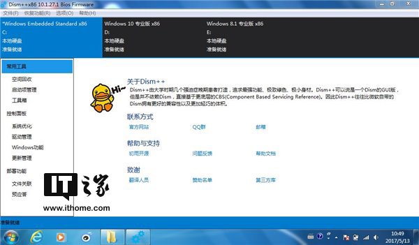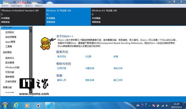 打开Dism++,上面就列出了你电脑上安装的系统列表。我这里演示的电脑装了Win7/Win8.1/Win10三系统,正好可以展示更新当前系统和非当前系统的方法。
