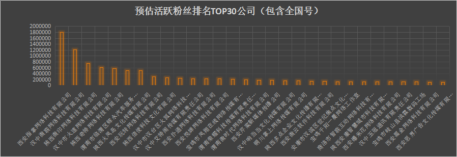 从预估活跃粉丝数量上看,对一个公司来说,拥有的互动粉丝资源越多,粘性越大,越有价值。从以下两个图形可以看出,在陕西省本地预估活跃粉丝上,陕西微印、陕西奇特、陕西火凤岛三家公司进入前3;含全国粉丝的进入前3分别是西安指掌、汉中微联、陕西微印。这个纬度上同时上榜单也只有陕西微印。