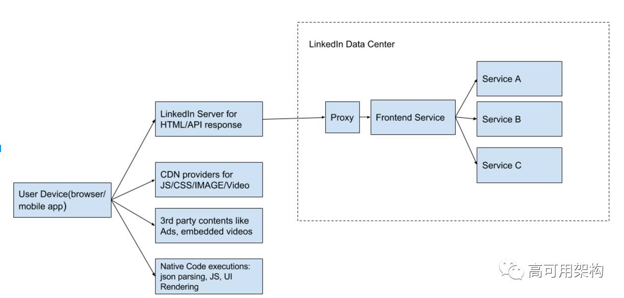 最终用户的一次点击将导致对多个系统的多个请求。 如下图所示,一个典型的页面视图包含对数据中心的 API 请求,image / JS / CSS 请求到 CDN,以及一些向第三方(如广告)的请求。 这些请求分布到多个系统,我们需要一种方法在一个地方跟踪它们。