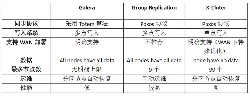 X-Cluter、Galera、Group Replication 三种方案相比而言:Galera 是先驱,然而从实现原理以及目前的表现上上无法支持阿里的目标。GR 是官方出品但 GA 时日尚短,这两个开源的产品在功能和性能上在实测评估中无法满足阿里的要求。